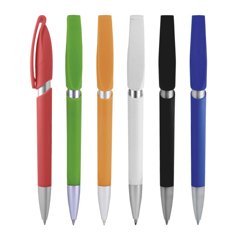 Apertura retráctil con pulsador. Clip plástico, color plata en punta y cuerpo. Tinta negra.