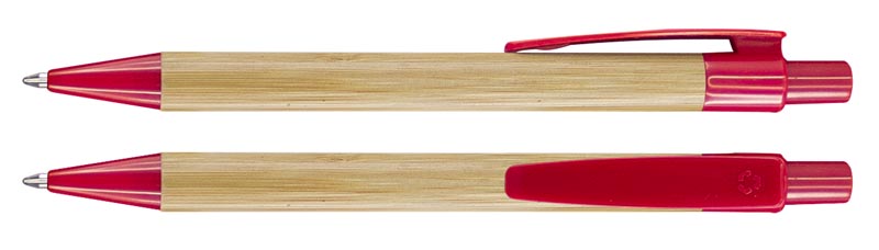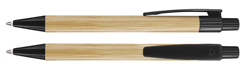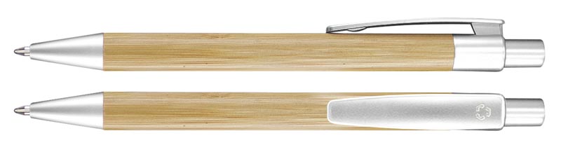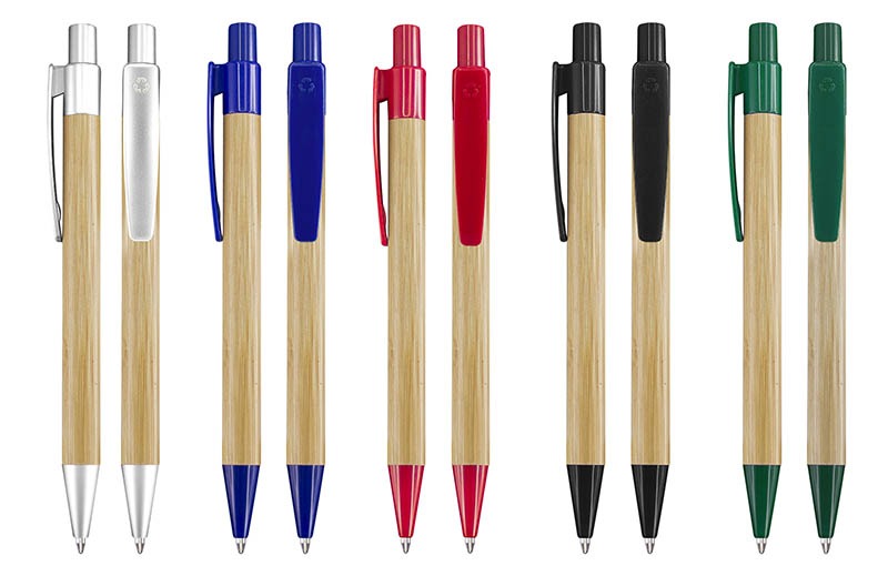 Cuerpo de madera de bambú, terminales de plástico PET reciclado. Escritura azul.