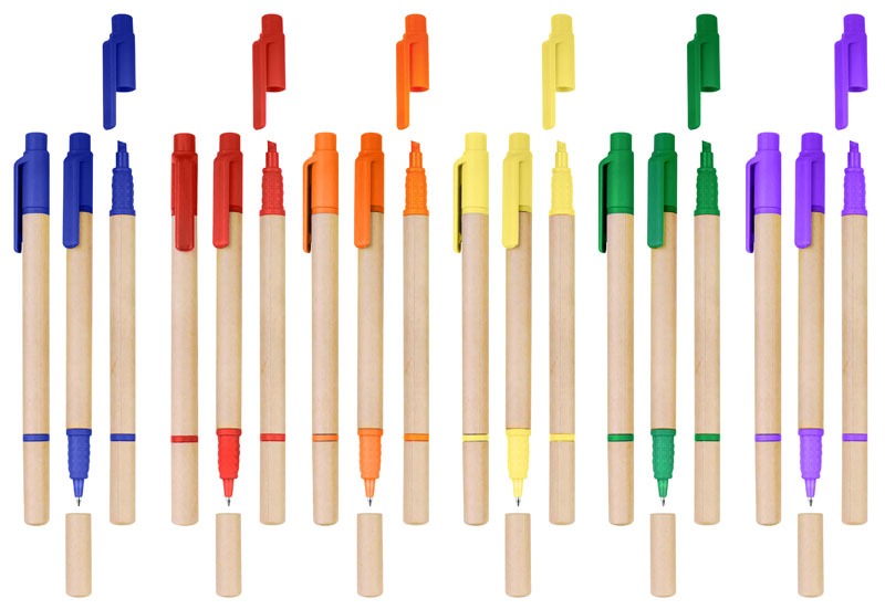 Bolígrafo ecológico de cartón reciclado con destacador de color. Escritura azul.