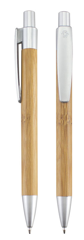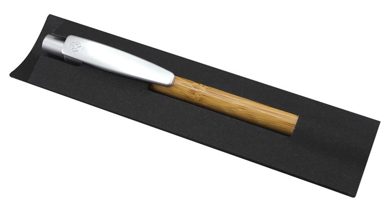 Bolígrafo de madera de bambú con terminales satinados. Refill plástico parker type. Escritura azul. Presentación individual en estuche de cartón reciclado.