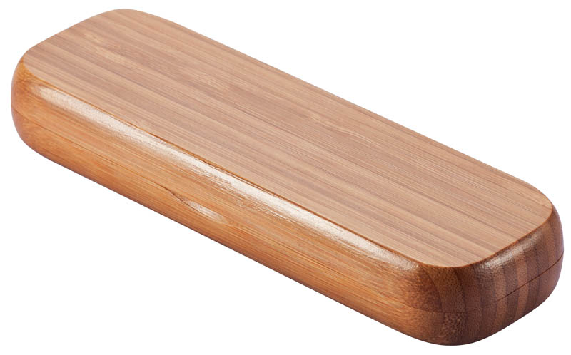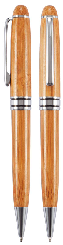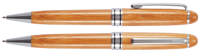 Set bolígrafo ejecutivo en madera de bambú con terminales palteados. Refill plástico parker type. Escritura negra. Incluye elegante estuche de bambú sólido. Presentación individual en caja de cartulina reciclada.