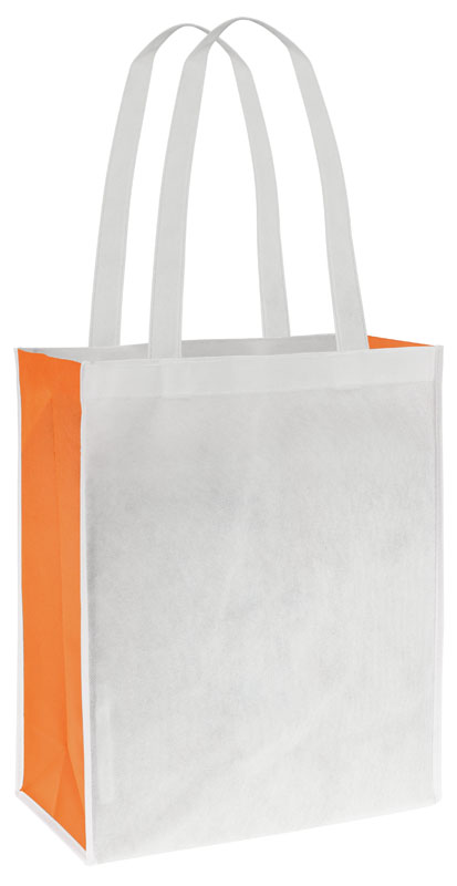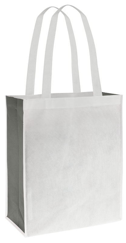 Tela TNT blanca y fuelle de color, 100% reciclable y reutilizable. Cuenta don 2 asas de 41 cm.