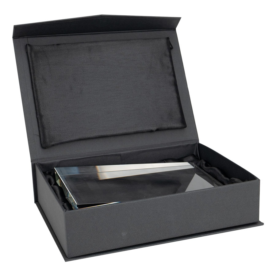 Elegante Trofeo Galvano de Cristal. Presentación en caja de cartón forrado negro con cierre imantado, interior acolchado de espuma y tela poliéster satinado negro.