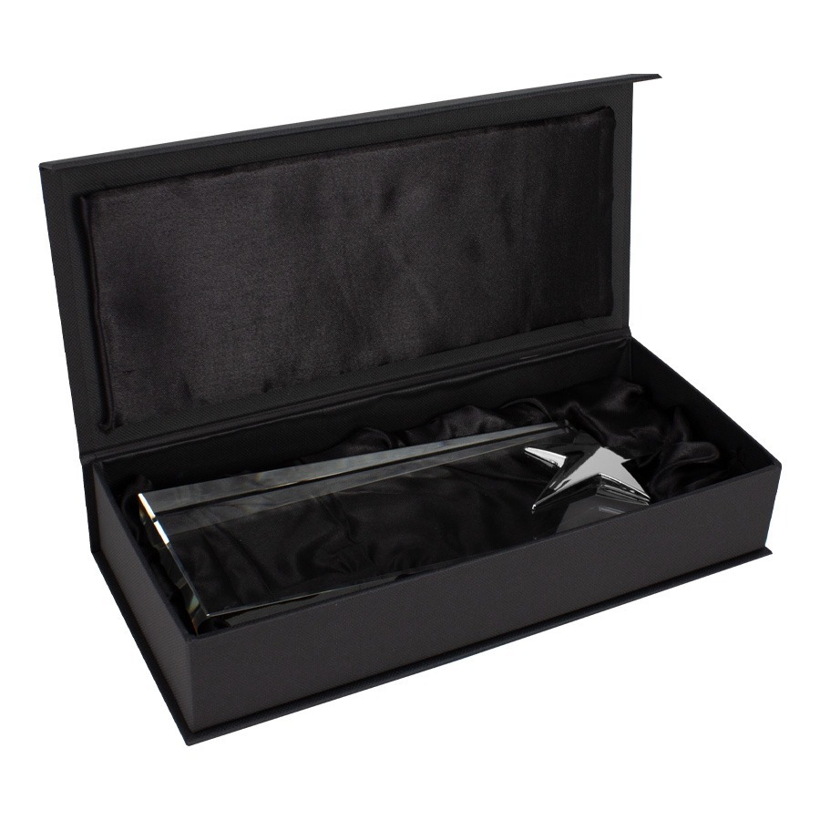 Trofeo Galvano de Cristal ideal para premiaciones, con estrella de acero inoxidable colores oro, plata y bronce a elección. Presentación en caja forrado negro con cierre imantado.