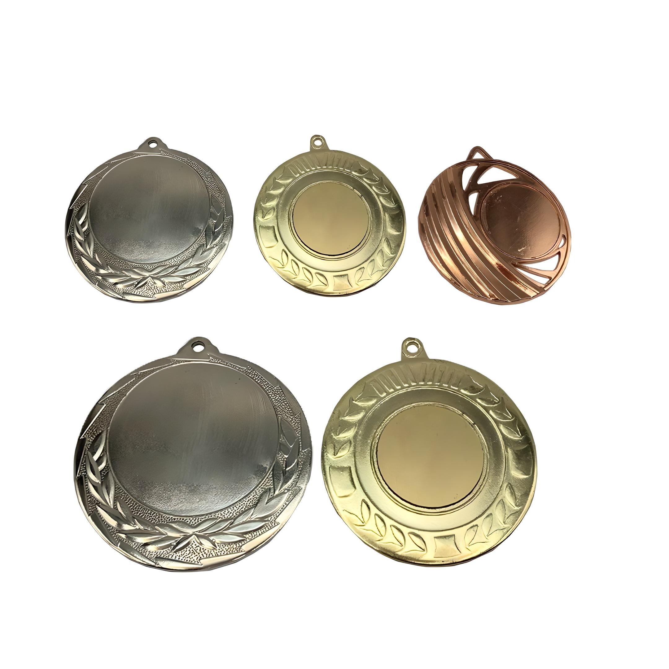 Medallas metálicas mediana. Incluye placa metalizada con grabado láser y una cinta para colgar con gancho metálico. Cintas tricolor, verde, rojo y azul.