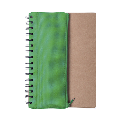 Libreta ecológica con estuche integrado y útiles, incluye: bolígrafo, 2 lápices grafito, regla, sacapuntas y goma para borrar.