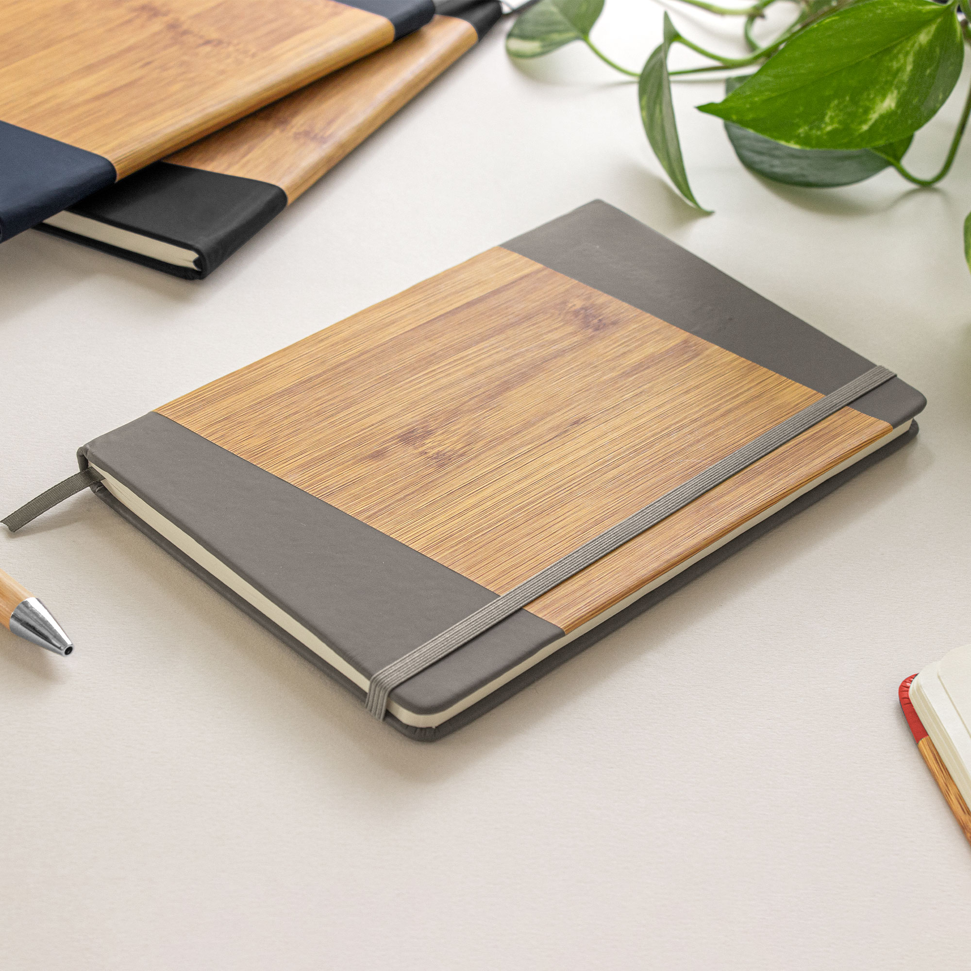 Tapa dura recubierta en PU de color, con estampado simil bambú. Interior 80 hojas rayadas en papel de 70 g. Cinta y cierre con banda elástica del mismo color.
