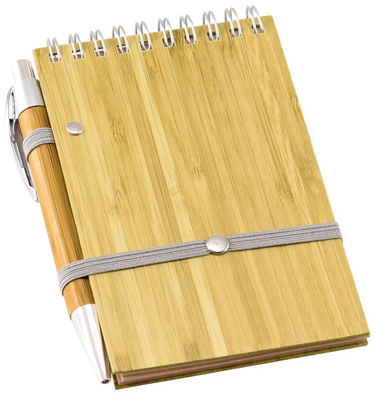 Libreta ecológica con tapas duras de madera de bambú, 70 hojas interiores lineadas de papel kraft y anillado metálico doble cero. Incluye bolígrafo ecológico de madera de bambú con detalles plateados.