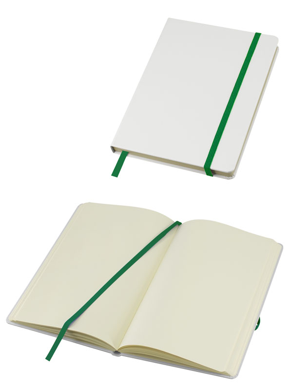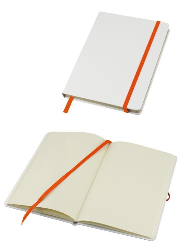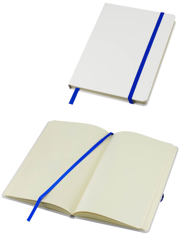 Cubierta PU simil cuero blanco de 1.5mm de espesor. Interior 80 hojas limpias amarillas de 80gsm. Incluye banda elástica y huincha separador de hojas de color.