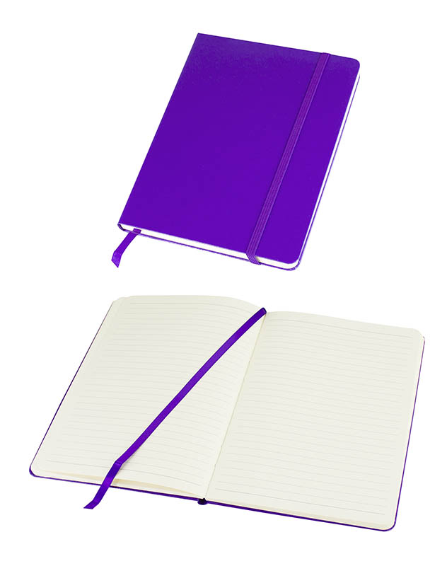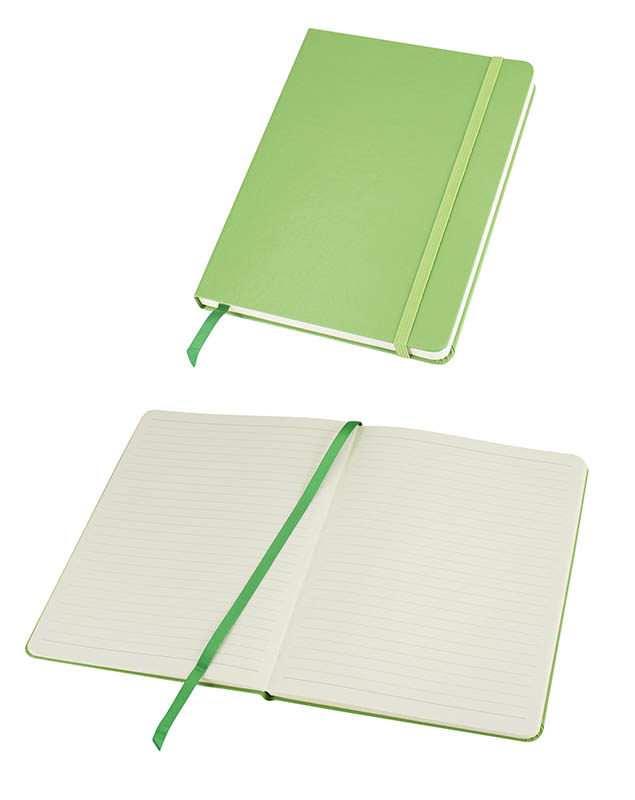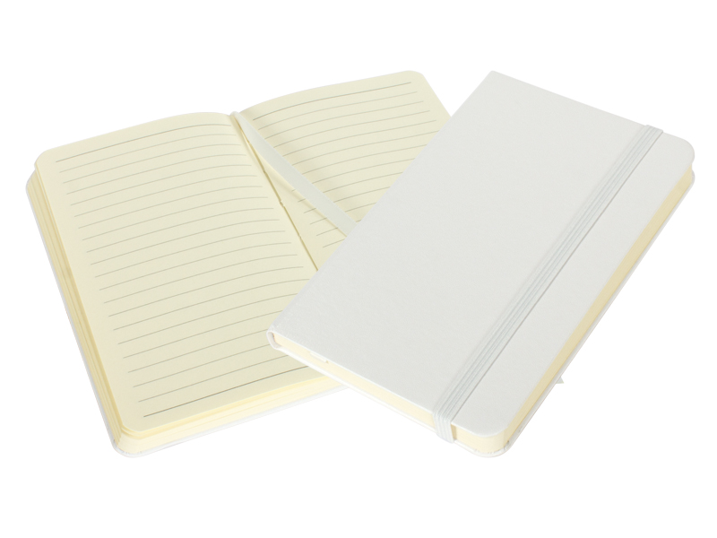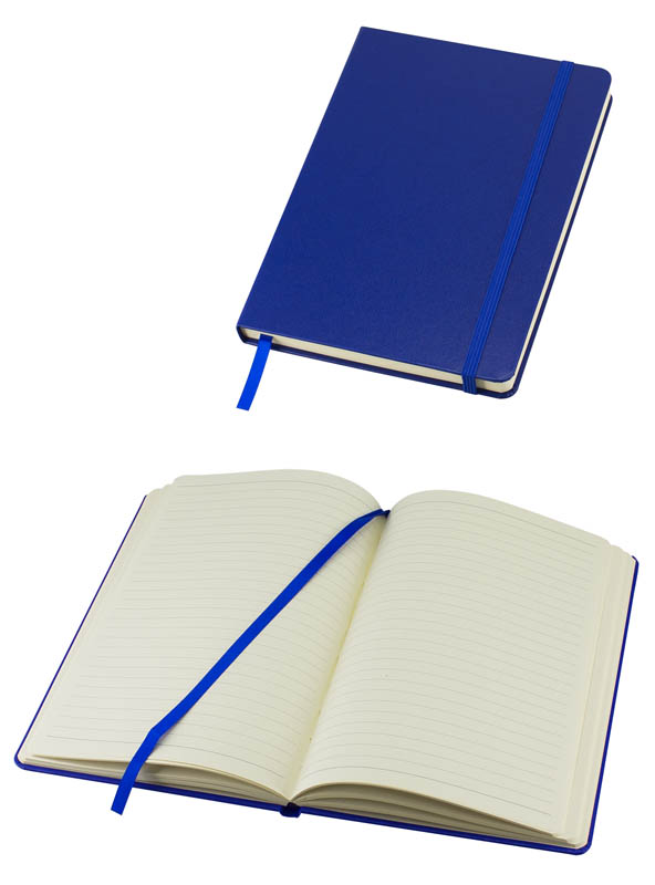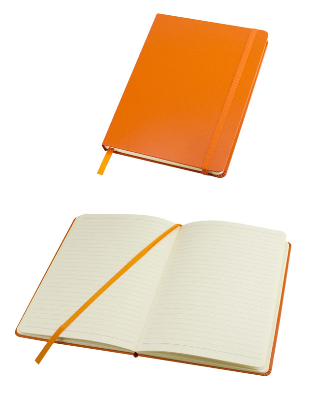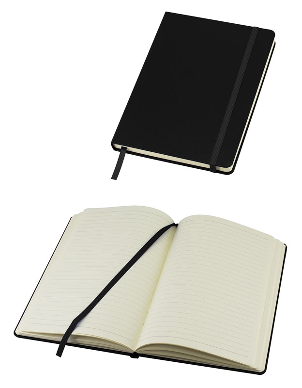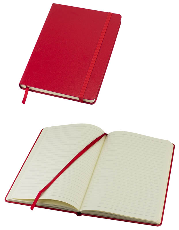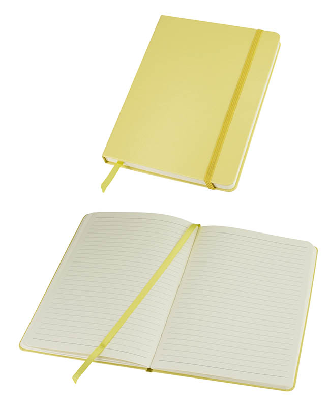 Cuaderno tamaño A5 (1/2 carta) con cubierta de cartón piedra forrada en PU simil cuero de color de 1,5 mm de espesor. Interior 80 hojas lineadas amarillas. Banda
