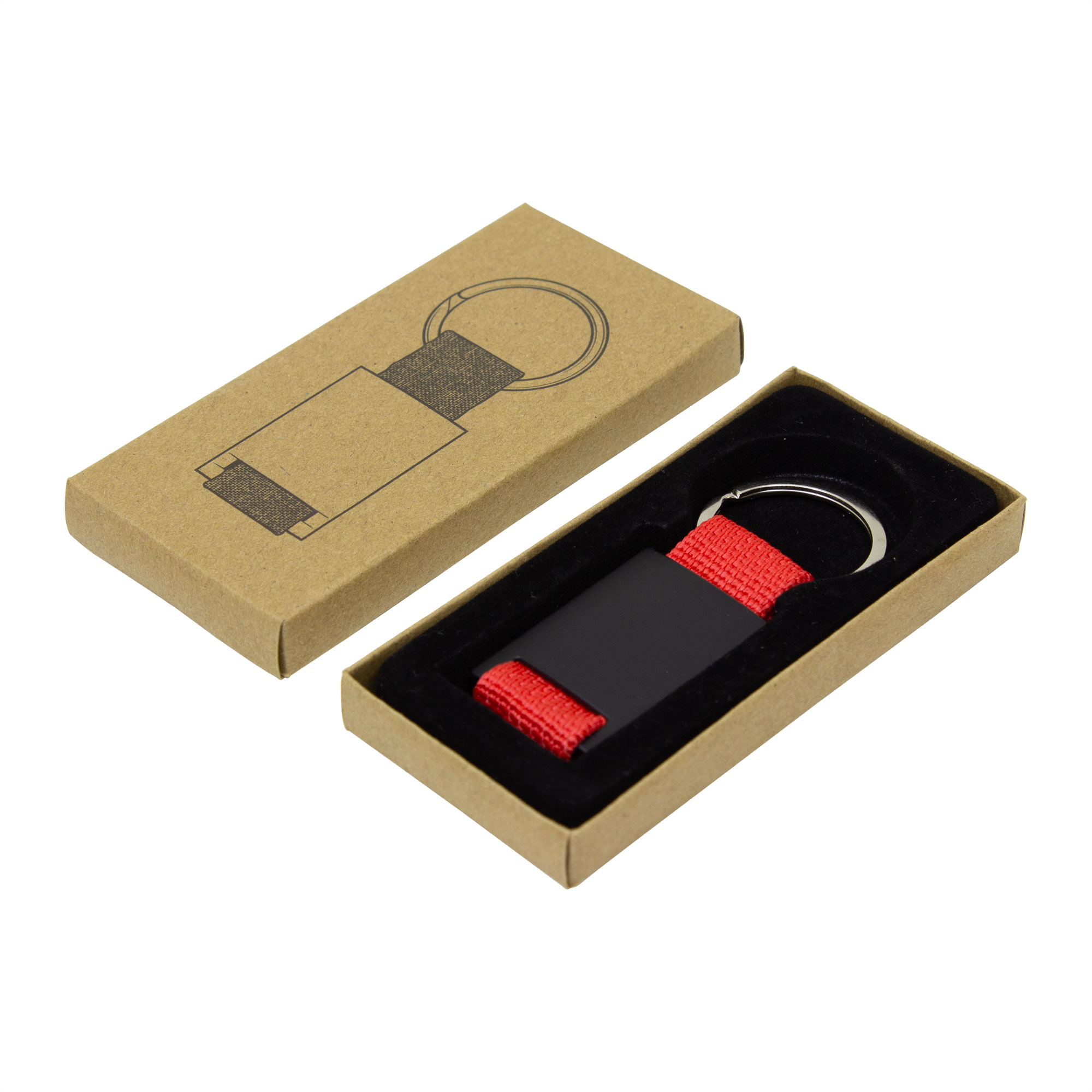 Llavero con aplicación de soporte metálico, terminación en negro mate. Correa lanyard disponible en distintos colores. Presentación en caja de regalo kraft con bandeja de terciopelo color negro.