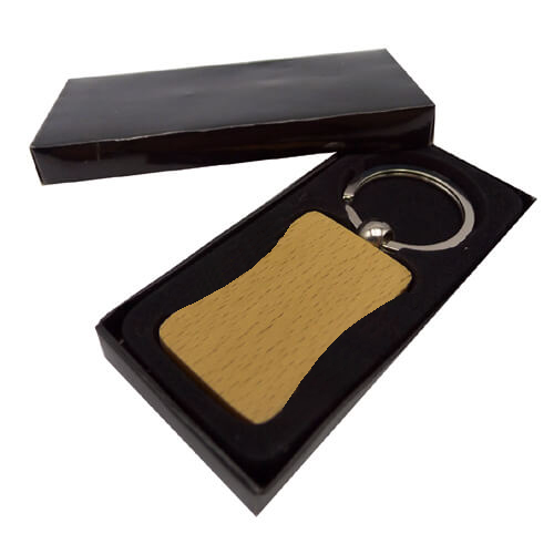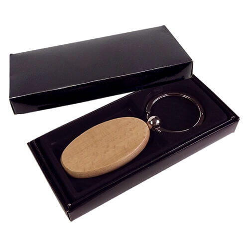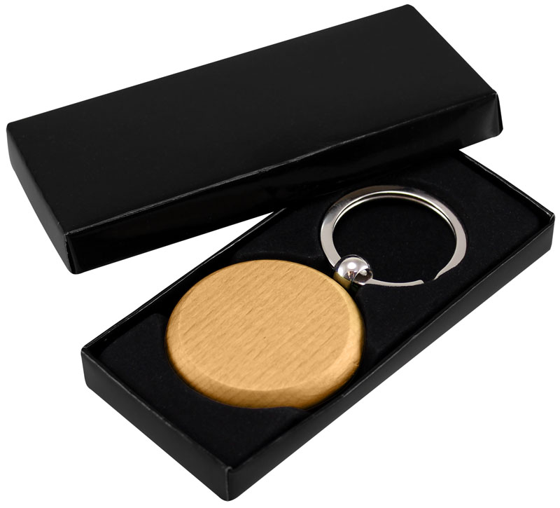 Llavero de bambú con diversas formas. Presentación en estuche de cartón laminado color negro con cuna interior de terciopelo.