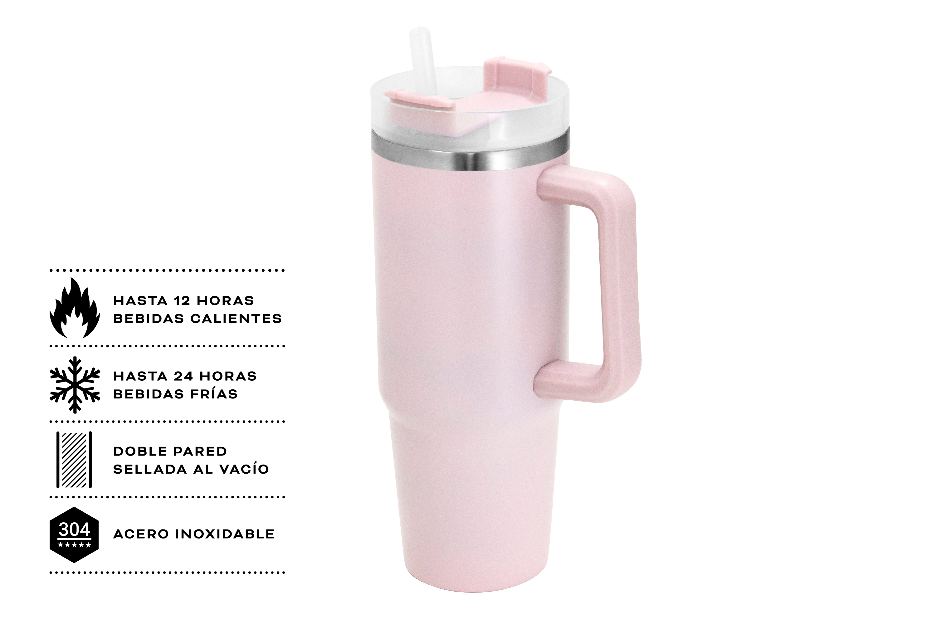 Mug de Acero inoxidable, doble pared, sellado al vacío con bombilla. Interior. Tapa antiderrame. Mantiene hasta 12 hs la temperatura de las bebidas calientes y 24 hs de las bebidas frías. Presentación en caja de regalo kraft. Capacidad: 880 ml.