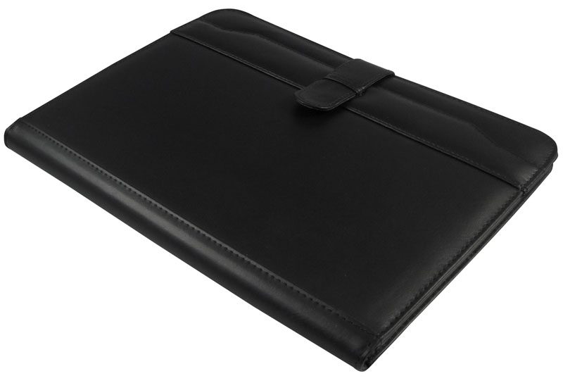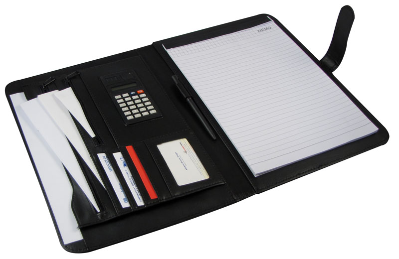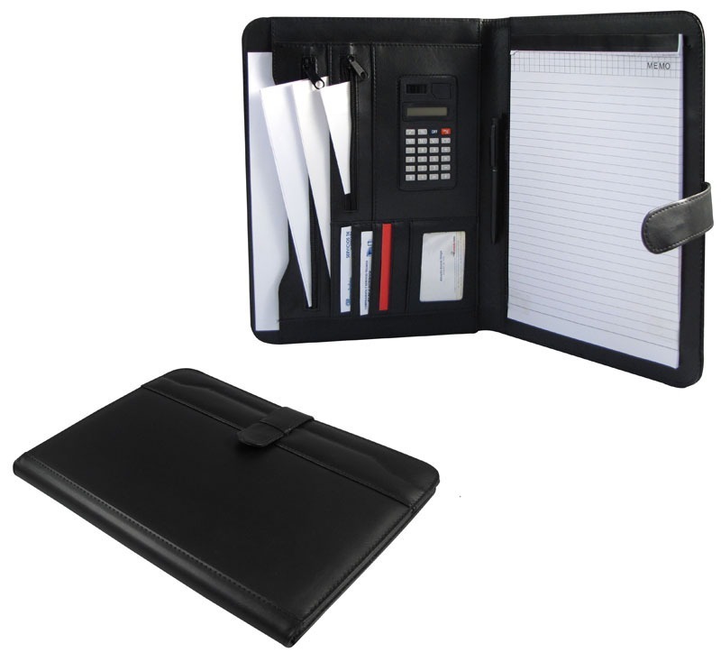 Simil cuero negro. En el interior incluye calculadora colar, block de 30 hojas lineadas tamaño oficio, bolígrafo negro pasta, bolsillo para documentos tamaño oficio, bolsillos con cierre y compartimentos para tarjetas.
