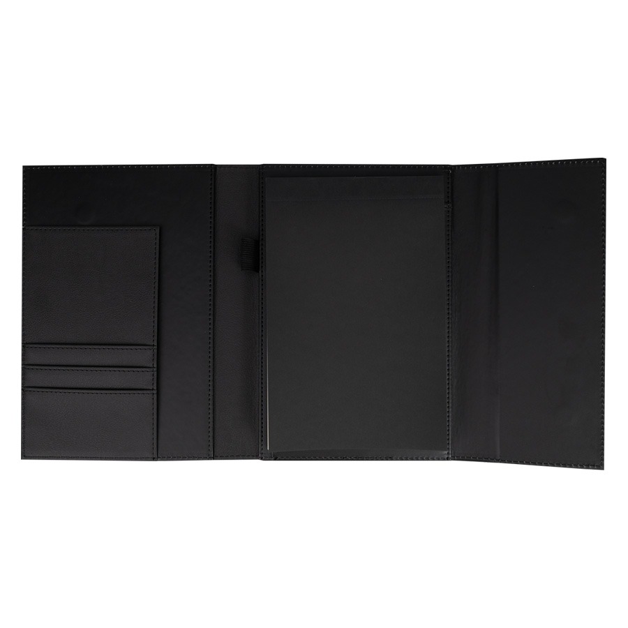 Incluye libreta de Apuntes con 50 hojas lisas amarillas de 13.5 x 20.5 cm., presentada dentro de fina carpeta de PU negro con interior porta-documentos, portabolígrafo y cierre imantado, protegida por lámina de tela no tejida color negro. Presentación en elegante caja de cartón piedra esmaltado negro y funda de papel negro.