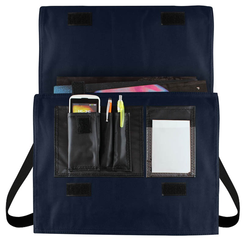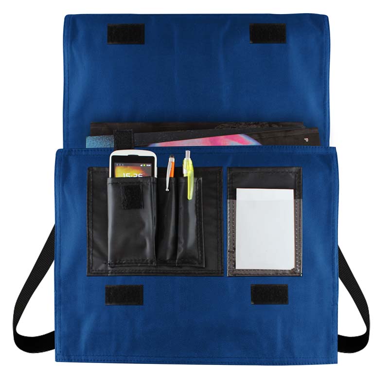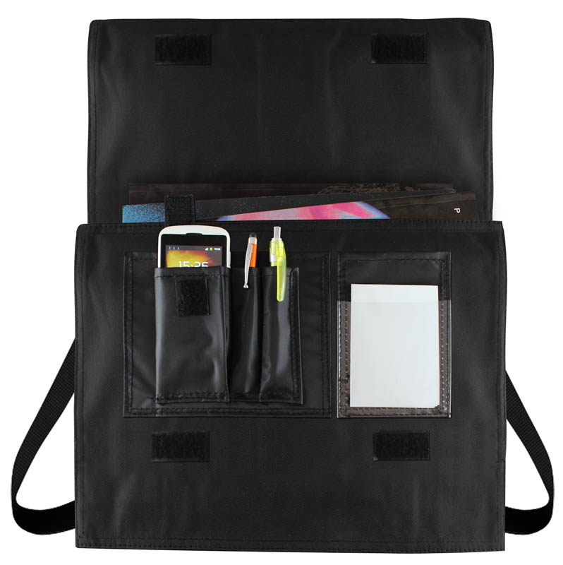 Tela raquelada polyester 600D con solapa y bolsillo interior multi-accesorios. Incluye banda reflectante en la solapa.