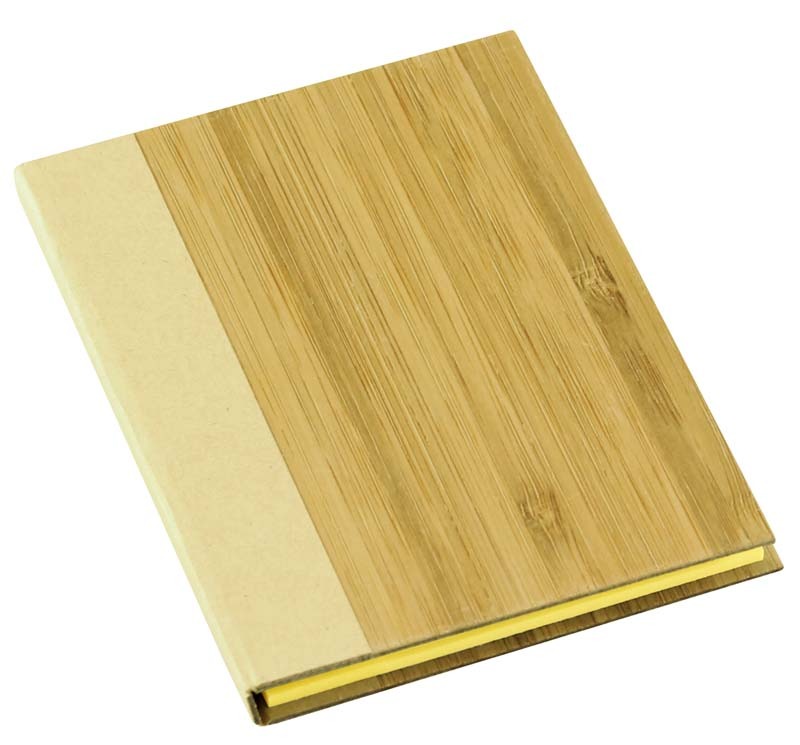 Memo Set con tapas duras enchapadas en madera de bambú. Incluye 50 post-it amarillos grandes, 25 post-it amarillos medianos y 125 banderitas de colores.