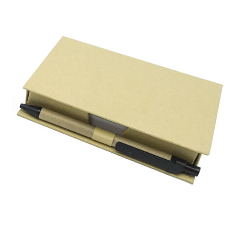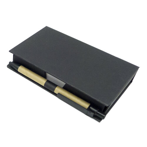 Memo set rectangular plegable que incluye set de post-it, block de notas, regla y bolígrafo ecológico. Tinta azul.