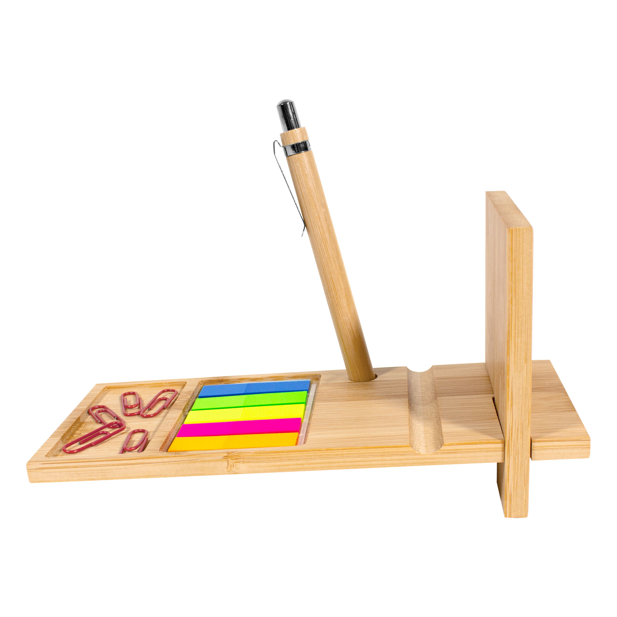 Organizador de escritorio con compartimentos para accesorios y ranuras porta bolígrafo y porta celular. Incluye bolígrafo, set de 5 señaladores autoadhesivos de diferentes colores y clips en color rojo. Presentado en caja de regalo.