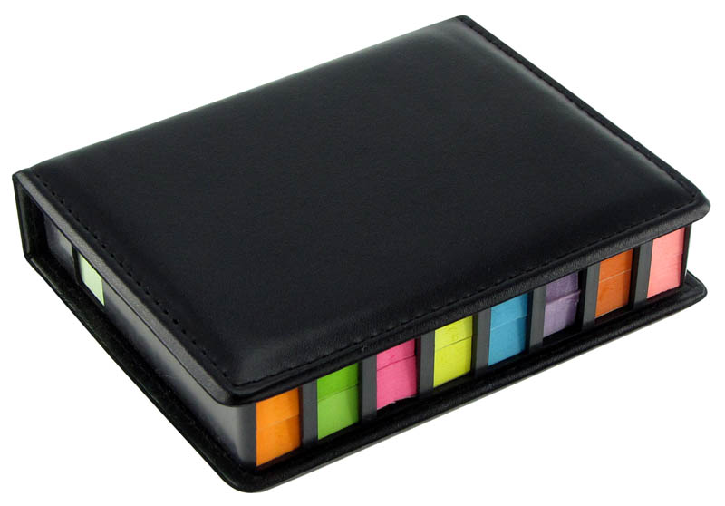 Memo Set de PU negro con post-it y banderitas adhesivas. Incluye 200 post-it rectangulares + 200 post-it cuadrados + 1.600 banderitas adhesivas de colores.