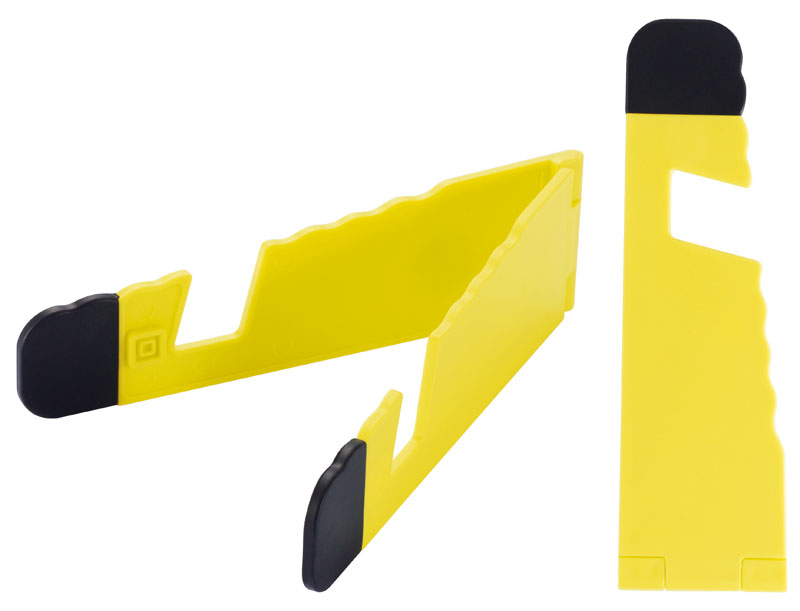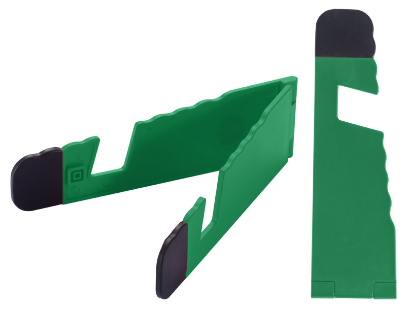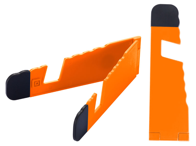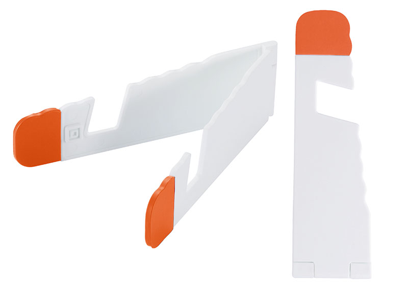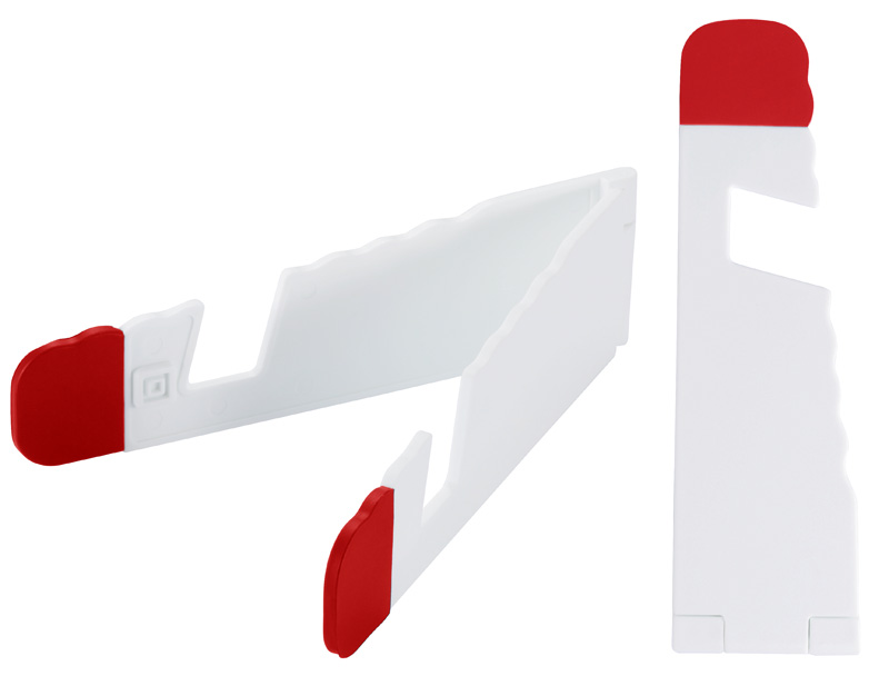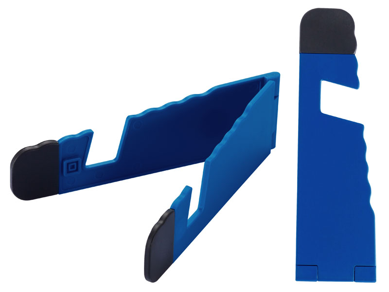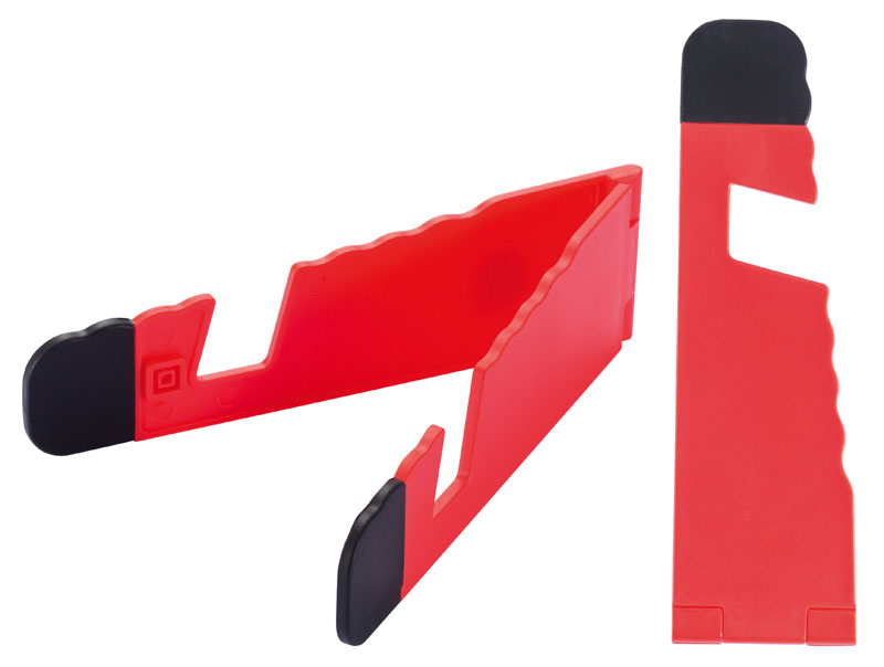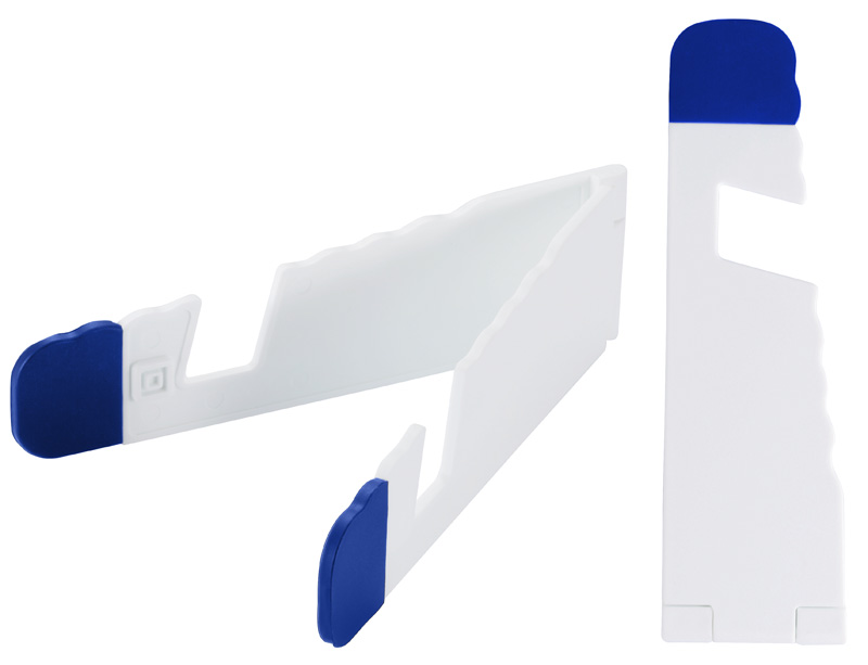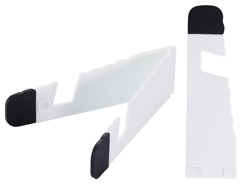 Soporte plástico abatible de escritorio ideal para tablet y celular, con goma antideslizante en ambos terminales.