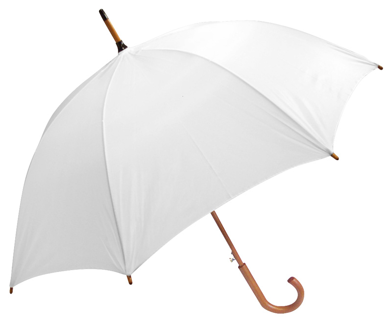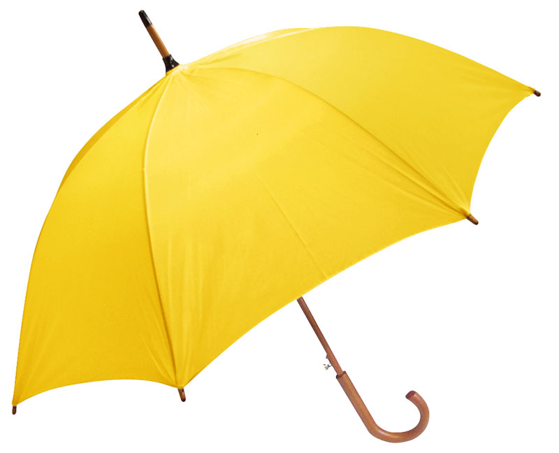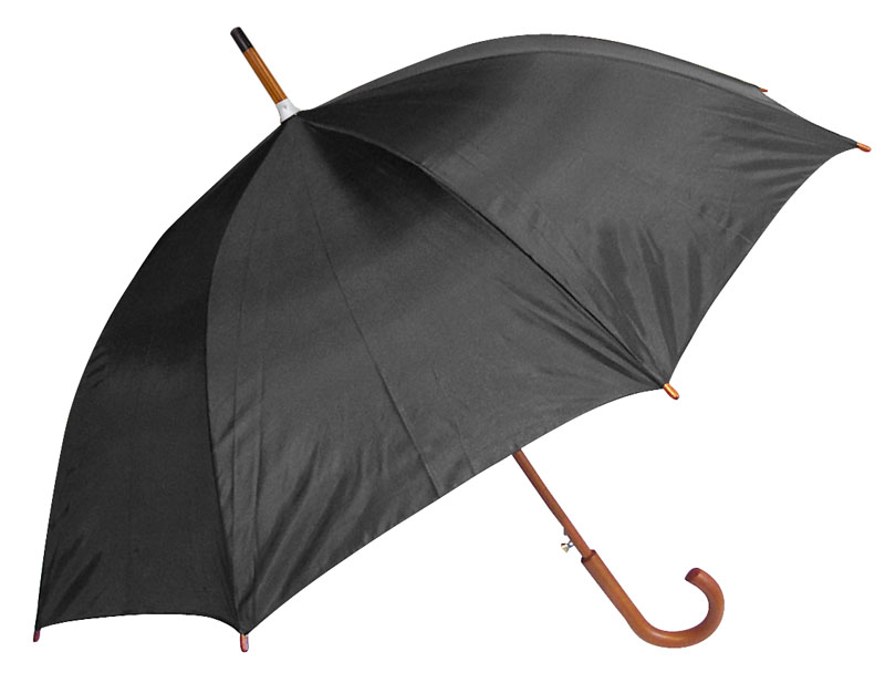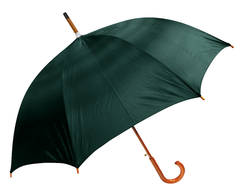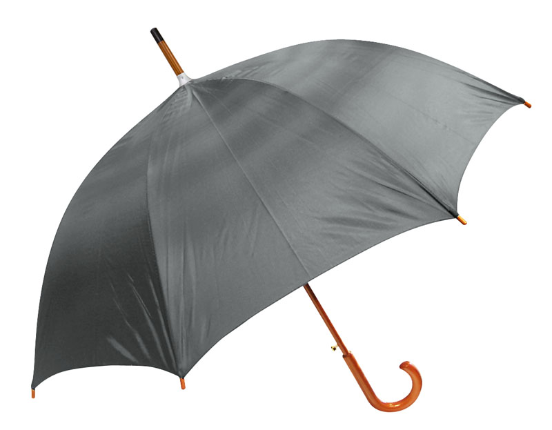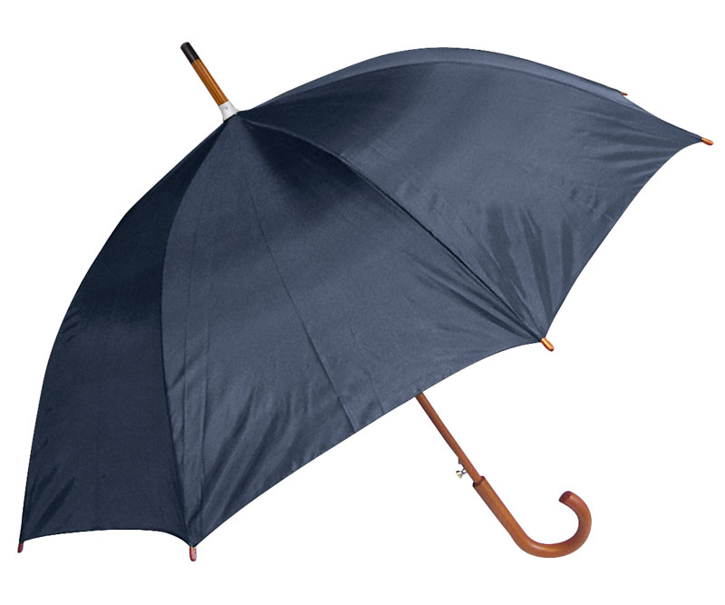 Cuerpo y mango curvo de madera barnizada. Varas reforzadas de fibra de vidrio, apertura automática, 8 cascos de tela nylon.