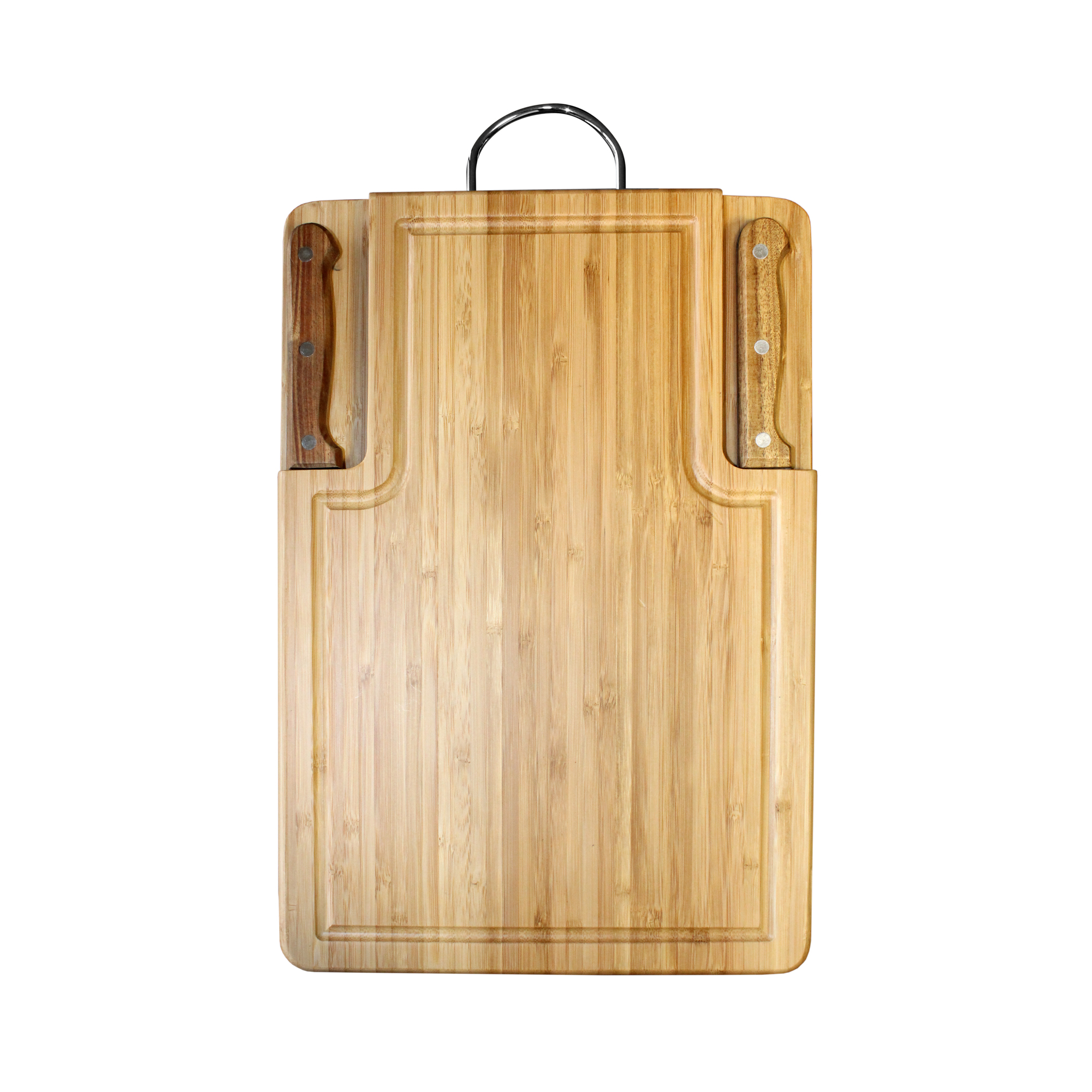 Set de parrilla con tabla, cuchilla, tenedor asador y manilla.