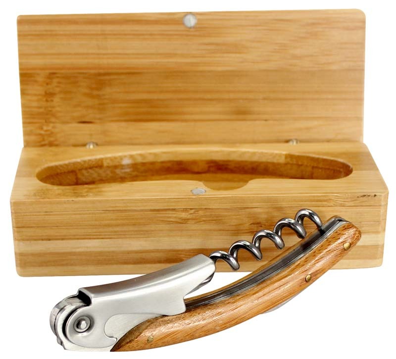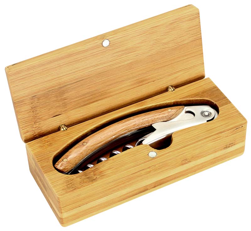 Multiherramientas para el vino, en caja sólida 100% madera de bambú, con cierre imantado. Incluye descorchador, destapador y abre-sellos.
