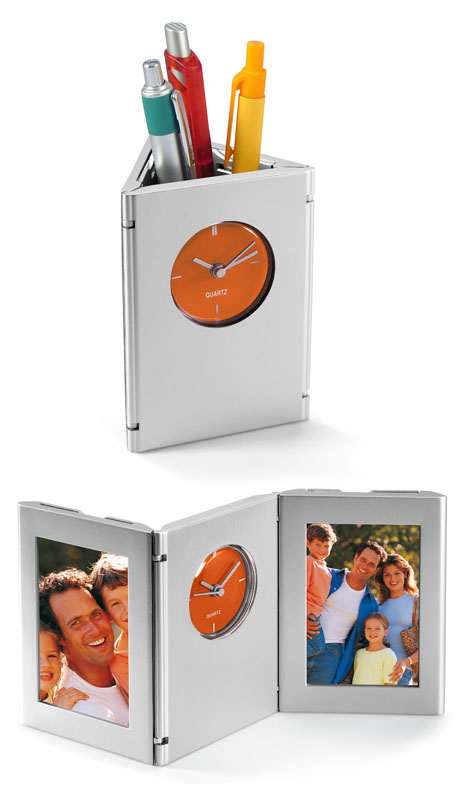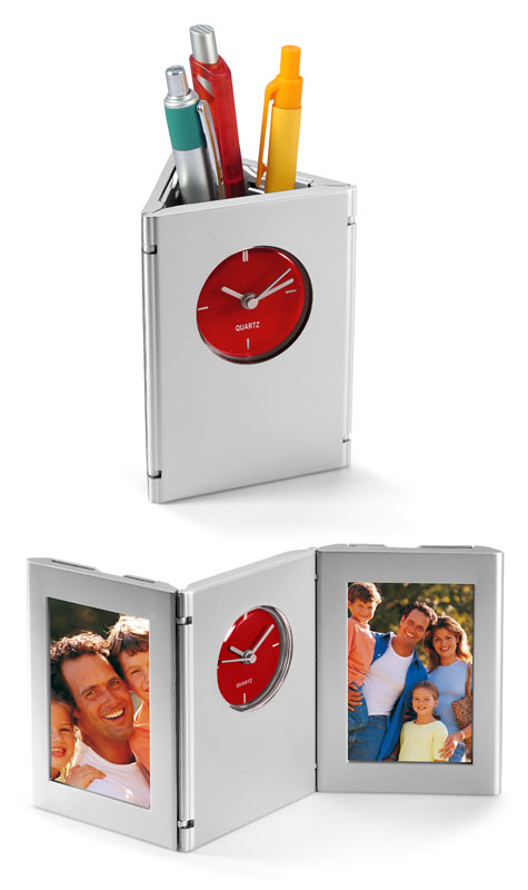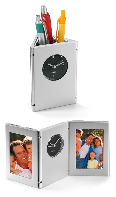 Porta-Lápices plegable con reloj análogo y dos porta-fotos laterales, cuerpo gris plata.
