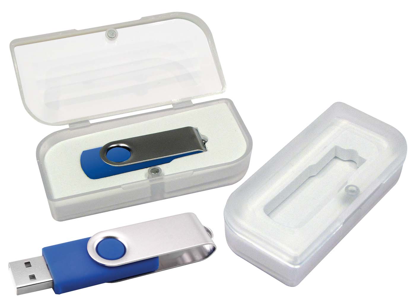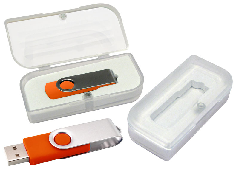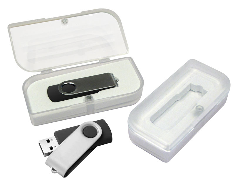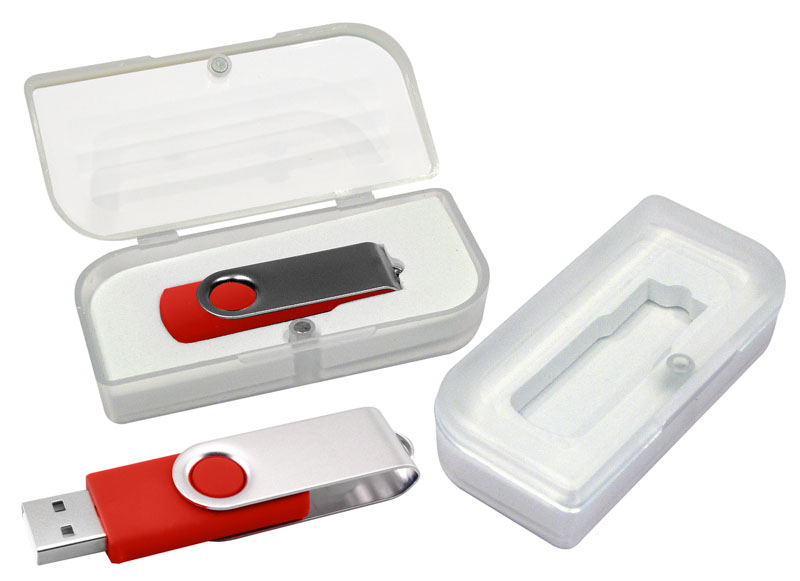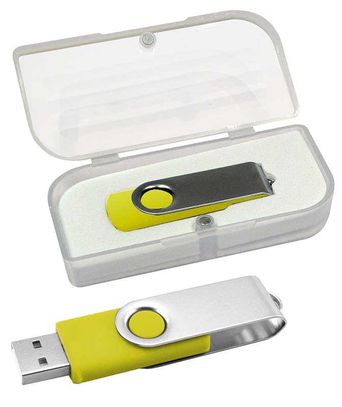 Pendrive con protector metálico giratorio. Incluye caja acrílica. Capacidad: 16 GB.