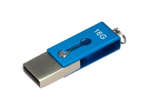 Mini-Pendrive 2.0 dual OTG-ANDROID con 16GB de memoria, con cuerpo y carcasa metálica de giro. Con sistema OTG dual, terminales USB y Micro USB, para conectar directamente al computador o al teléfono celular Android. Presentación en práctico blister de cartón reciclado con ranura para ganchera, y estuche plástico translúcido para remover el pendrive directamente. Capacidad: 16 GB.