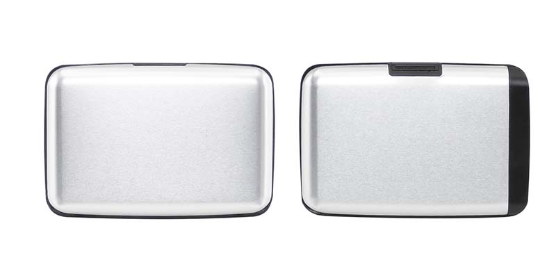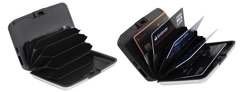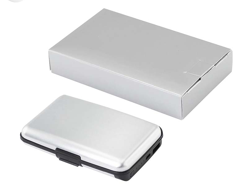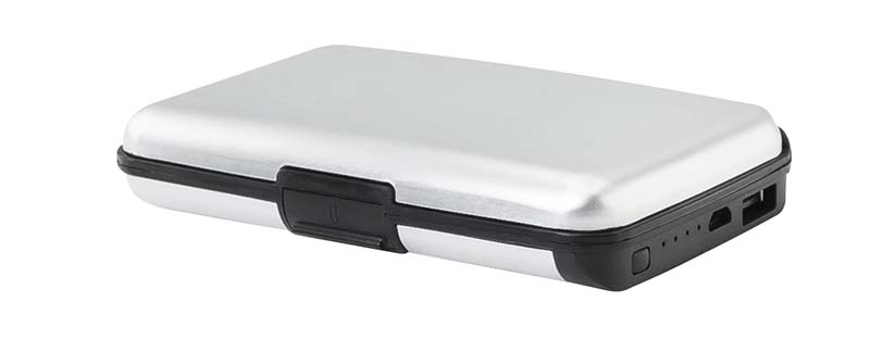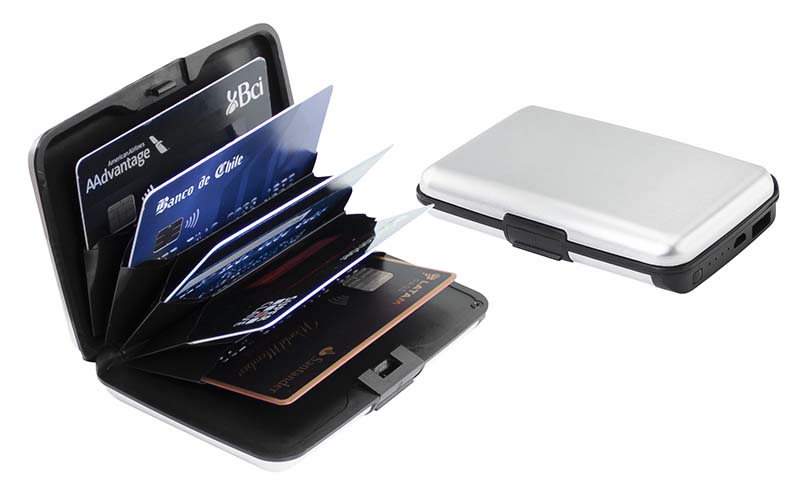 Estuche rígido Porta-Tarjetas con protección anti-clonación. Capacidad interior para 6 Tarjetas. Incluye cargador de celular Power Bank de 2.500 mAh, con indicador de carga y cable USB/Micro USB.