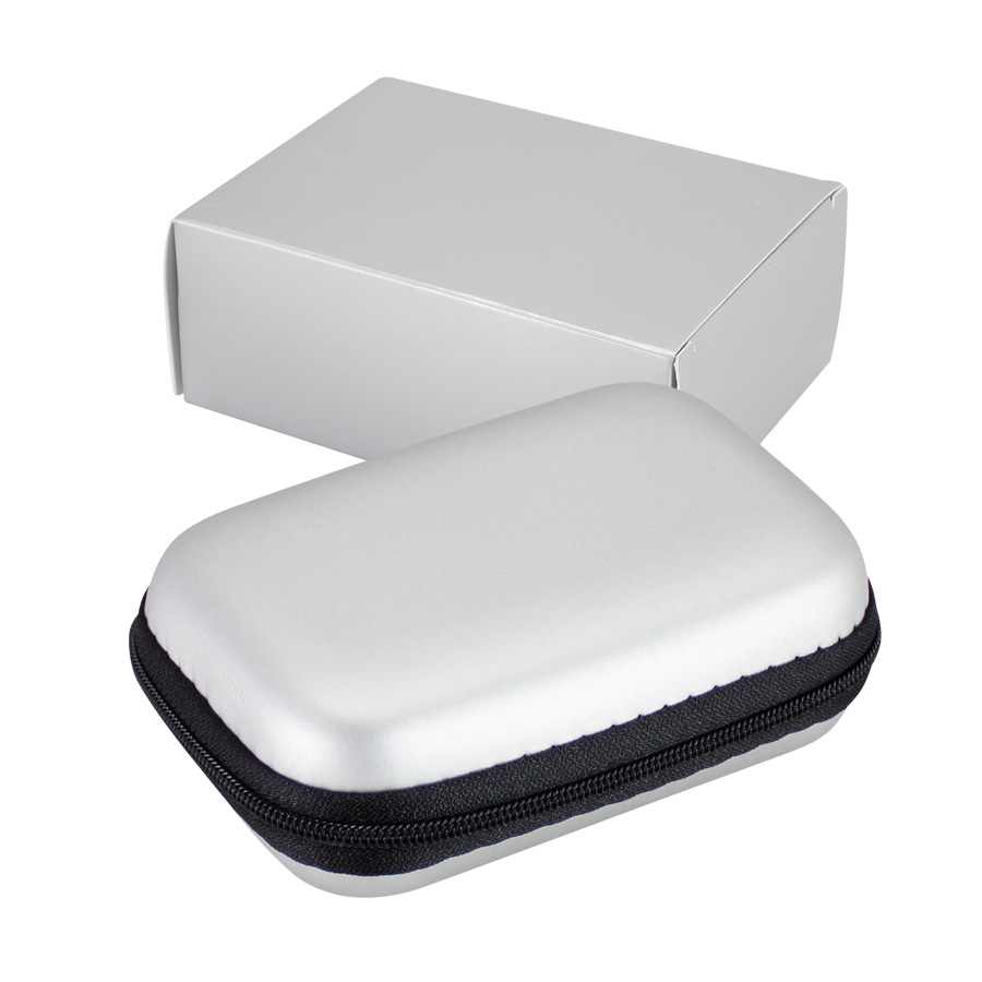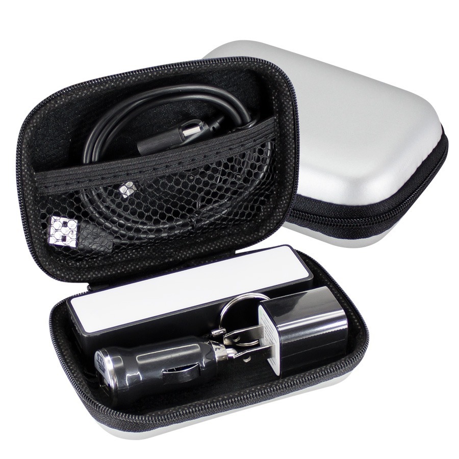 Kit de Conexión para el Automóvil. Contiene cargador USB para encendedor / toma de corriente del automóvil, Power Bank de 2500 mAh, toma-corriente con terminal USB y multi-cable adaptador USB de 1m de largo, con 3 terminales para iPhone / Samsung / Type C. Presentación en estuche plateado con interior negro, en caja de cartulina plateada.