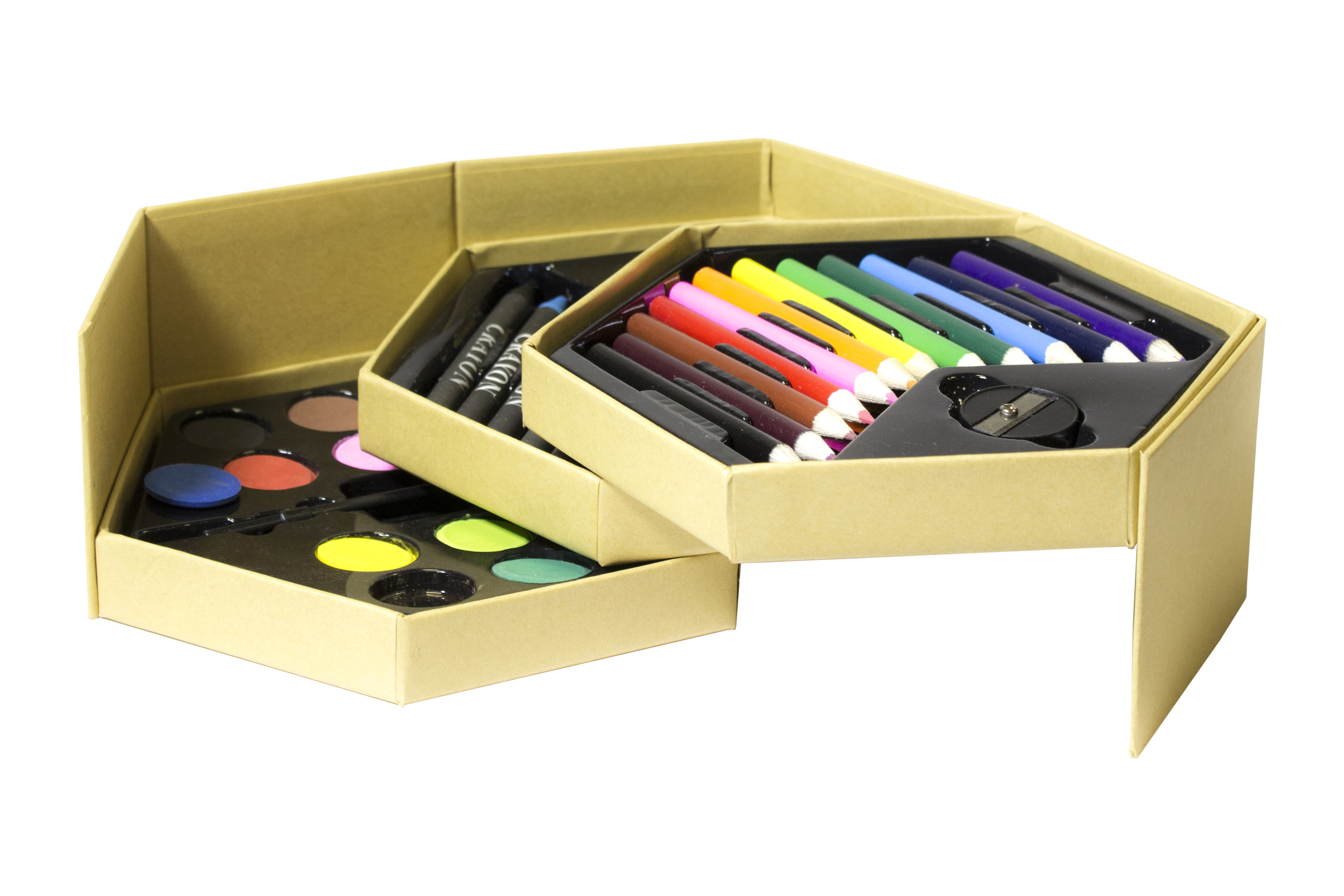 Cartón. Set de pinturas en forma de hexágono. 12 lapices de colores, 1 sacapuntas, 12 crayones, 1 goma de borrar, 12 acuarelas y 1 pincel.